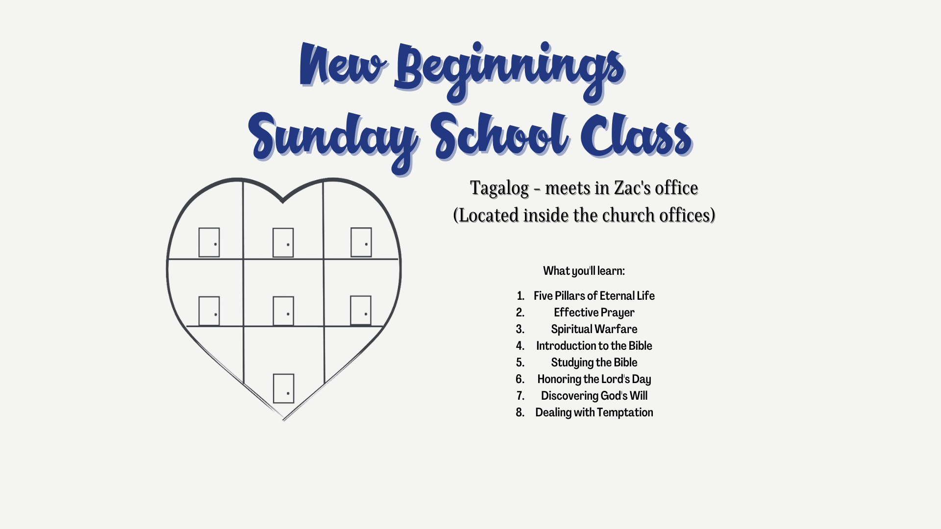 Ang klaseng ito ay nilayon para sa mga bago sa pananampalataya o kamakailan ay muling inilaan ang kanilang buhay kay Cristo. Nilayon na tumulong na hikayatin at palakasin ang inyong pananampalataya habang natututuhan ninyo ang susunod na mga hakbang na gagawin. Matatagpuan sa opisina ni Zac (sa loob ng mga katungkulan sa simbahan). Ang klaseng ito ay nilikha ni Pastor Pancho at pinadali ni Robert & Mariles Magalong