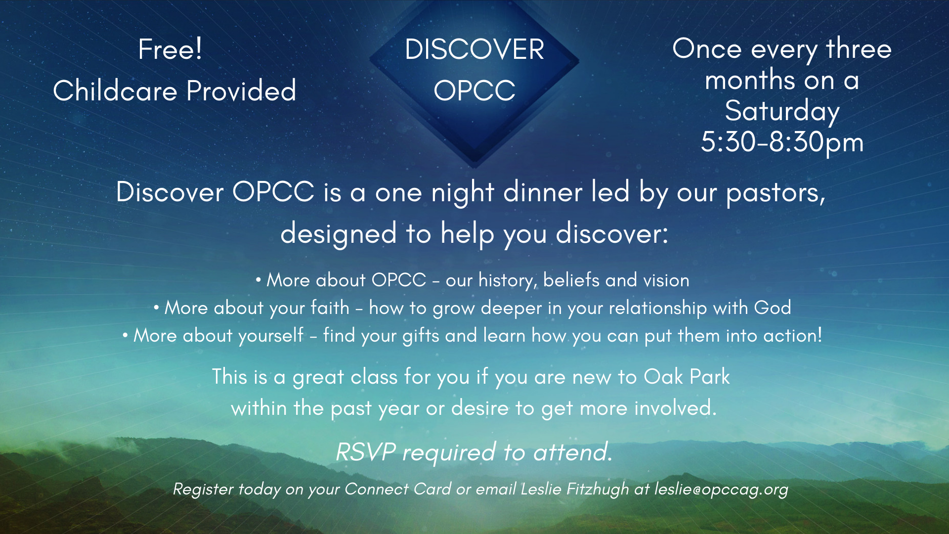 Want to know more about Oak Park Christian Center and have an opportunity to talk with our pastors? Discover OPCC is our "next steps" class that will help you to learn about our ministries, your spiritual gifts, and how to get more involved. This is a fun, interactive dinner in a small environment where we can get to know each other better!